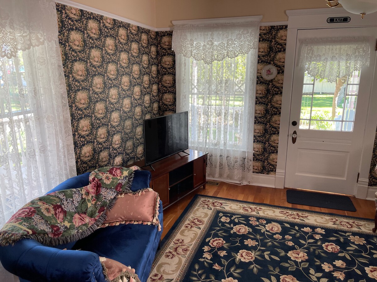 Du wirst diese charmante, einzigartige Unterkunft, das Hummingbird Room im Dusty Rose Inn, nie wieder verlassen wollen. Es ist ein sehr helles, helles und komfortables Zimmer, das in einer oberen Ecke des Dusty Rose Inn versteckt ist, komplett mit einem weißen, schmiedeeisernen Bett, Kleiderschrank, Couch und TV. Es nutzt das Gemeinschaftsbad im Obergeschoss (Gusseisenwanne), direkt vor der Tür, oder das Gemeinschaftsbad im Erdgeschoss (Dusche). Die Fenster leuchten hell und Kolibris können gelegentlich draußen fliegen sehen.