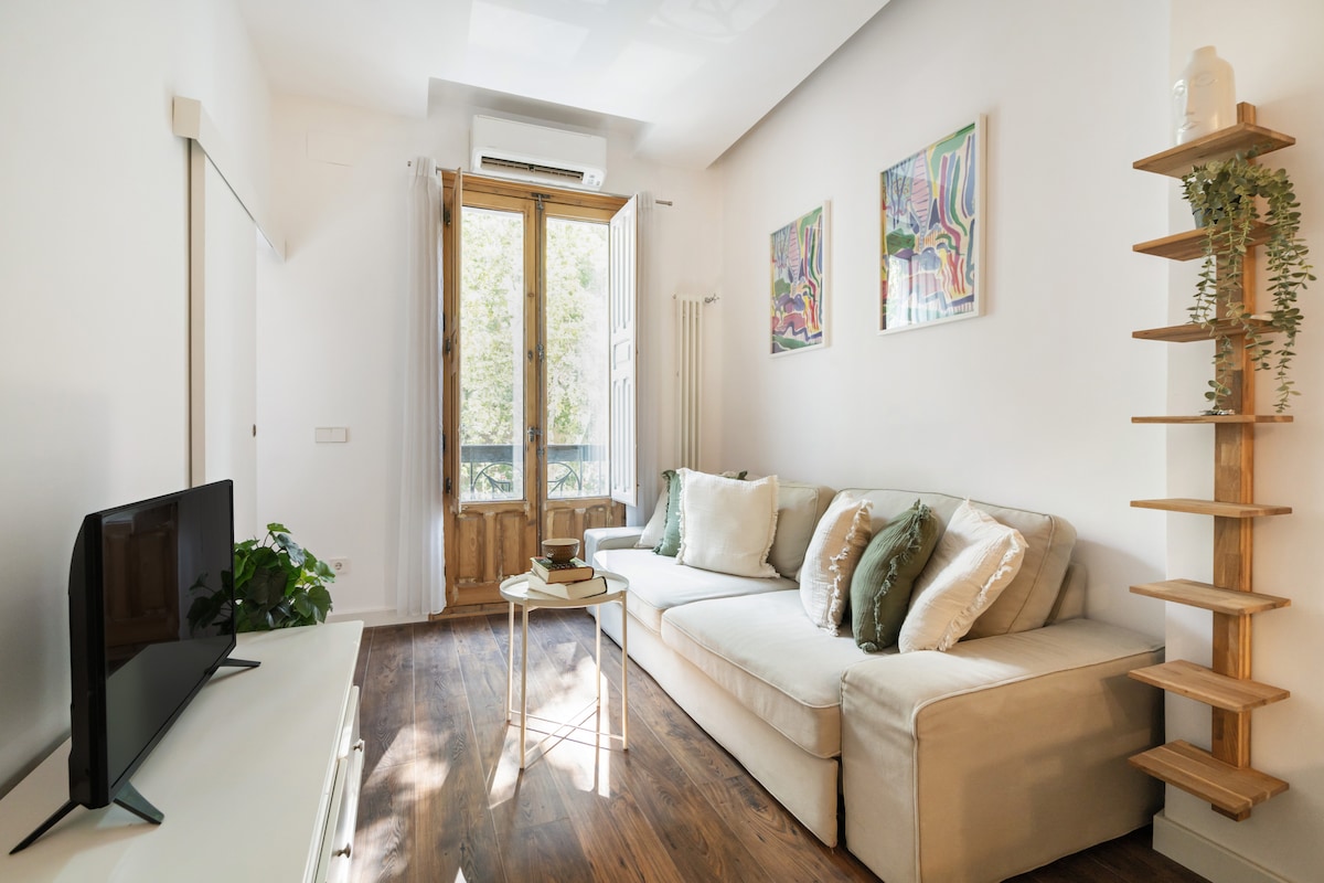 “Vine” apartment is located in Madrid center, off Gran Via, on a quiet street in a new building with elevator. It is nature-inspired, bright & modern, has WiFi, is fully equipped and is very close to restaurants, tapas, the Metro, shops & galleries. Best for a single, couples or couples with a kid! Pets are invited happily!!! The apartment is located in a new buliding, with an elevator! It is modern designed, with lots of greenery, themed to its name, Vine. A huge window along the length of the whole apartment overlooks a beautiful private garden. The apartment consists of a bedroom with a double bed, a living area with a single pull-out sofa, kitchen and bathroom. It has WiFi and is fully equipped, including a washing machine, TV, air conditioning, and Nespresso coffee maker - all just ready for your comfort and enjoyment! The apartment is a studio open space apartment - and it's all yours to enjoy! There are no areas in the apartment that you cannot use or access! We love hosting, but also respect our guests' privacy! We are here for you as much as you would like! Located just off Gran Via in lively buzzing Malasana neighborhood with its great range of authentic cafes, tapas & bars. Huge Zara Primark & Mango are minutes away. Best Madrid sites like Royal Palace, Puerta del Sol & Museums are in walking distance The Central Metro Station Gran Via is a 2 minute walk from the apartment. From there you can take the metro to anywhere you want in Madrid and also to all the train stations that will take you out of Madrid to the rest of Spain. If you come by car, a big parking lot is located at Barco 1, Madrid, just a minute from the apartment. There is also a bicycle-rental station close by. A hosting kit of water, soda, milk, coffee, tea and sweetners will be waiting to welcome you :-)