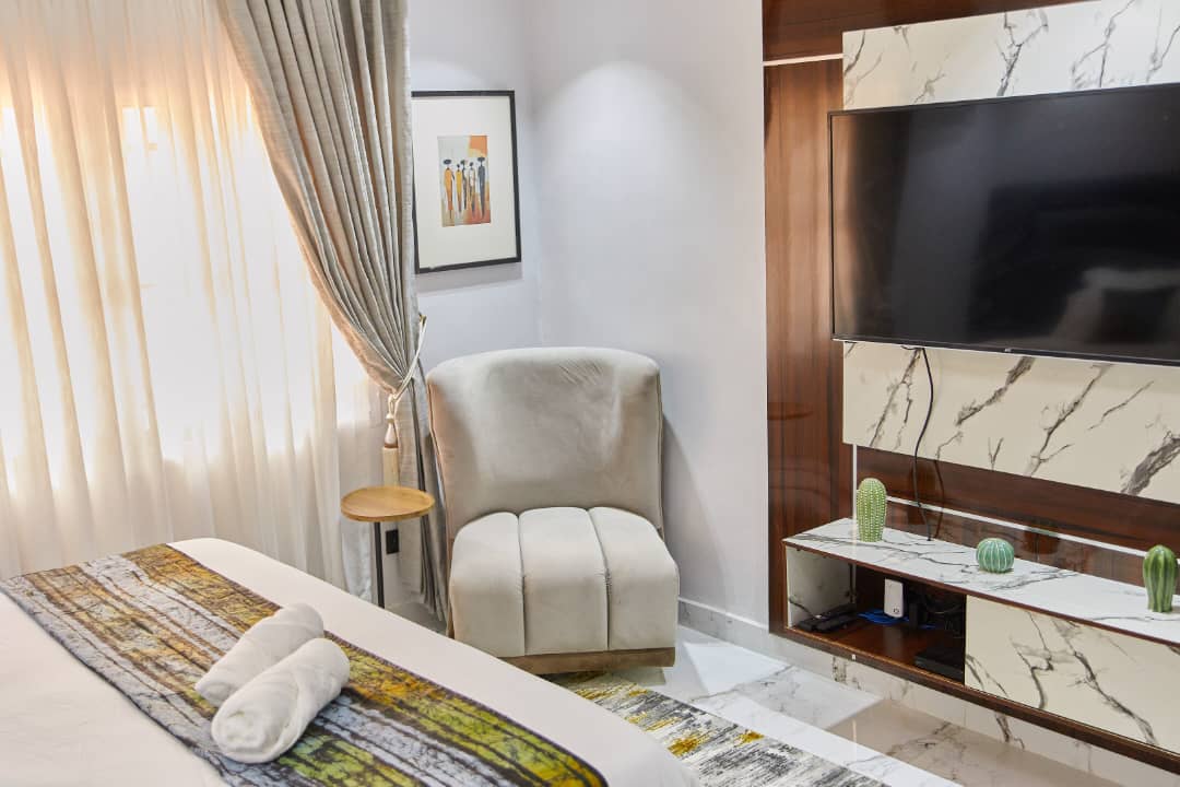 Willkommen in den Delight Apartments, die sich im ruhigen High Castle Estate in Lagos befinden. Erlebe unvergleichlichen Komfort und Bequemlichkeit in unseren durchdacht gestalteten Wohnungen. Ganz gleich, ob du geschäftlich oder privat unterwegs bist, unsere Unterkunft erfüllt alle deine Bedürfnisse für einen unvergesslichen Aufenthalt. Von reibungslosen Check-ins bis hin zu außergewöhnlichem Service ist jeder Aspekt deines Erlebnisses sorgfältig auf deine höchste Zufriedenheit ausgelegt. Gäste lieben uns für unser Engagement für Exzellenz und unsere Liebe zum Detail.