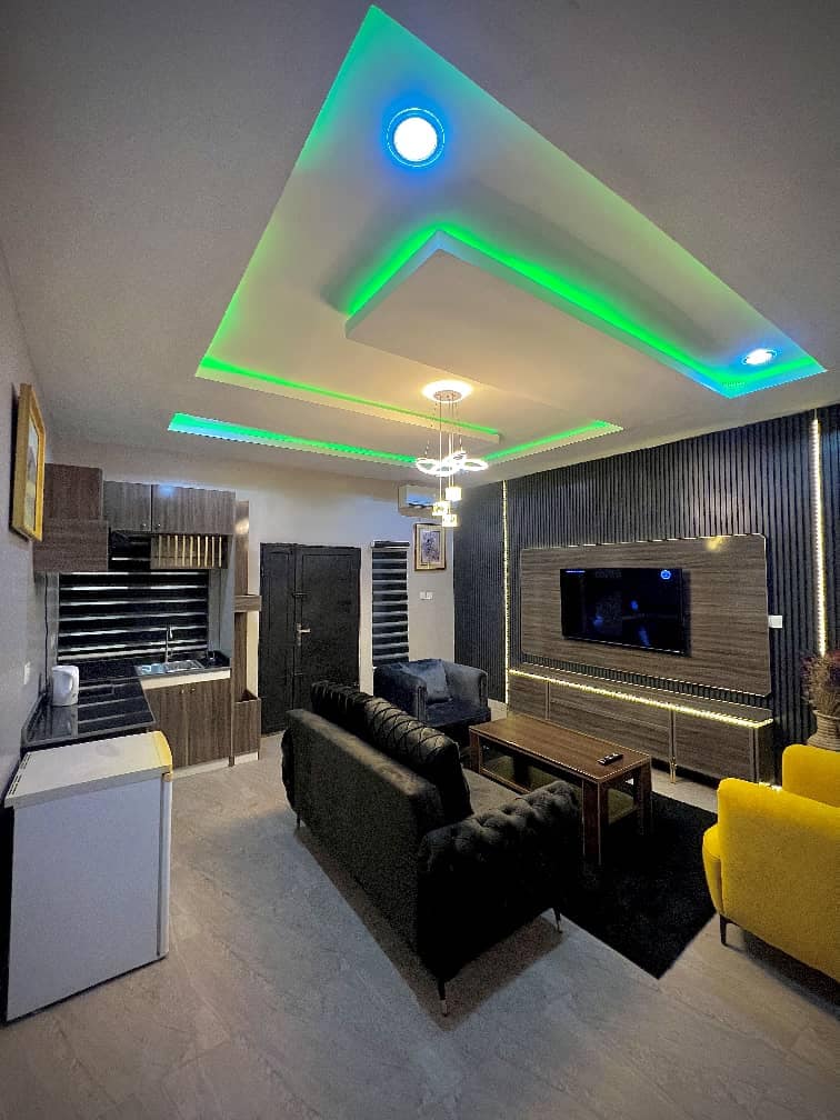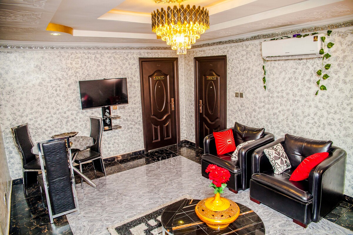 Eine 2-Zimmer-Wohnung mit erstklassiger Ausstattung, die Komfort und Entspannung bietet. Das Hotel liegt in einer ruhigen, friedlichen und ruhigen Umgebung in Agbelekale, Ekoro Road, abseits von Abule-Egba, Lagos. Die Straße ist verriegelt. Klimaanlagen, Smart-TV + Decoder, Gefrierschrank, Kühlschränke, Wasserkocher, Waschmaschine, Essbereich, 24/7 Stromversorgung mit Generator & Solarwechselrichter, WLAN, Arbeitsbereich, Nähe zu Einkaufszentren & Flughafen. Die Klimaanlage läuft mit öffentlichem Strom und Generator.