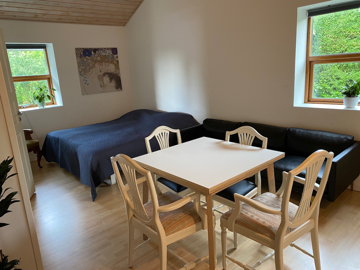 Der Anbau befindet sich in unserem Garten und bietet Platz für 2 Personen. Es besteht die Möglichkeit eines Bettes für ein Kind auf dem Sofa. Das Bett ist 160 cm breit. In der Küche befindet sich eine Nespresso-Kaffeemaschine und eine Fritteuse zur Zubereitung kleiner Mahlzeiten. Bei gutem Wetter kann der Morgenkaffee auf der Terrasse genossen werden. Es gibt kalte Getränke im Kühlschrank, die du kaufen kannst. Das Hauptraum mit Bad und Eingang ist ca. 30 Quadratmeter groß - Terrasse ca. 7 Quadratmeter. NB. Mindestaufenthalt 2 Nächte
