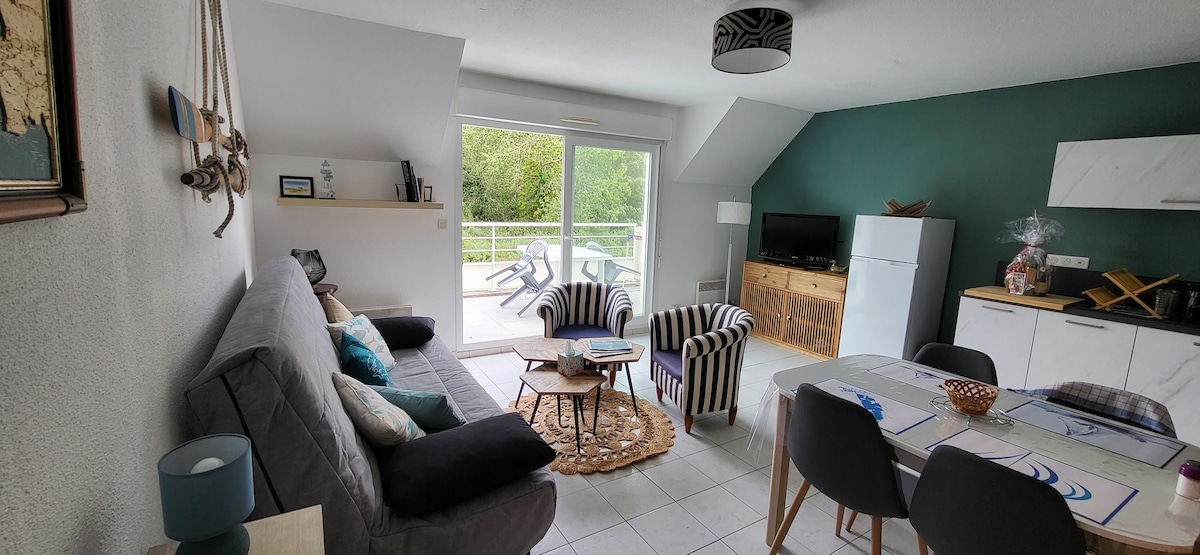 Wir stellen Ihnen eine Wohnung von 40 m2 zur Verfügung, die wir einladend und warm, mit allem Komfort, am Meer haben wollten. Wir hoffen, dass Sie wie wir die Mahlzeiten mit Blick auf die Mündung des Flusses Pont l'Abbé und die legendären Sonnenuntergänge genießen werden. Sie können auch die Mole mit ihren Terrassen und Restaurants genießen. Für Muschelfreunde ist das Angeln zu Fuß möglich und ein Austernzüchter in der Nähe. Kleiner Markt jeden Montag in der Saison.