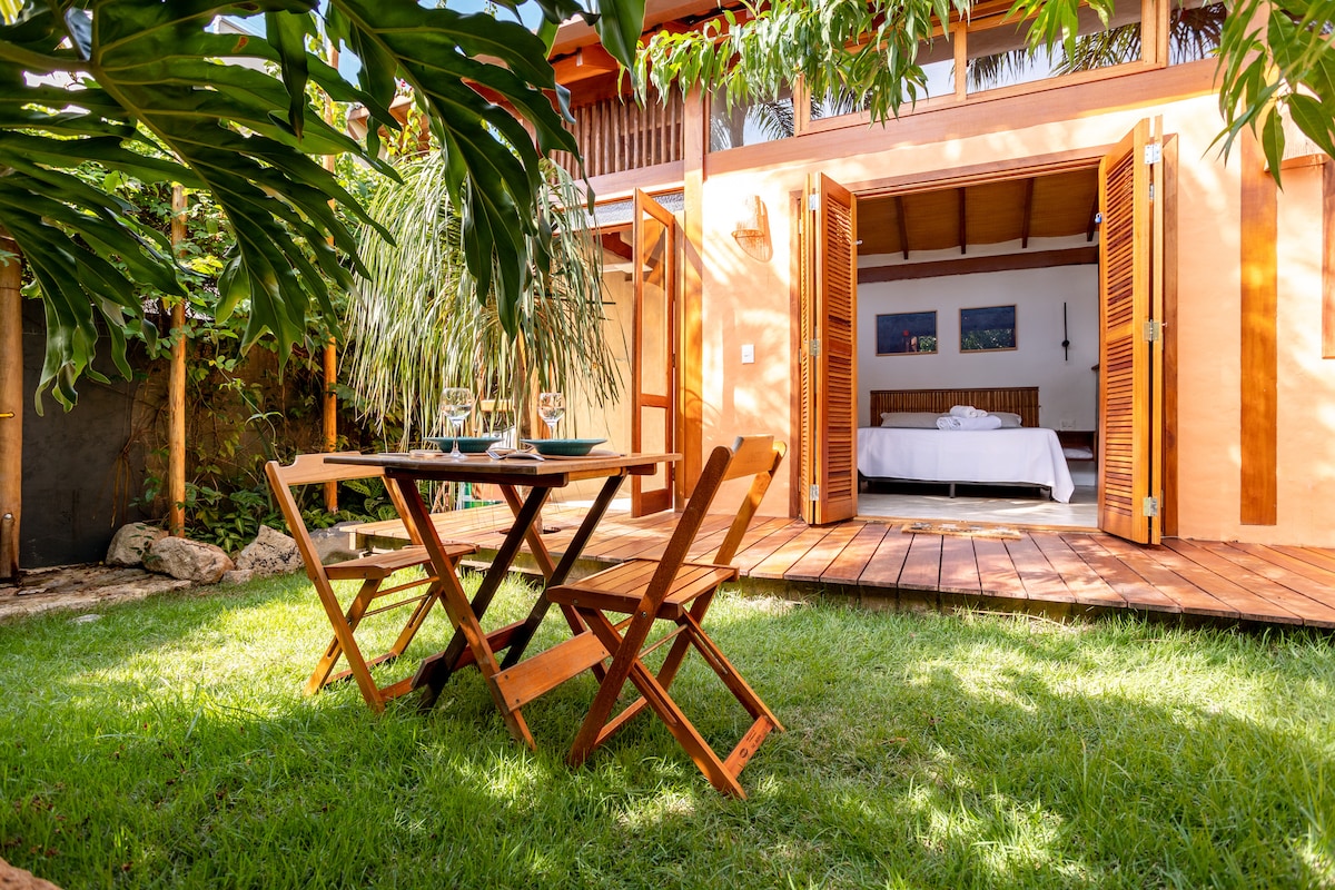 Chalé com jardim, 3min a pé da praia!
