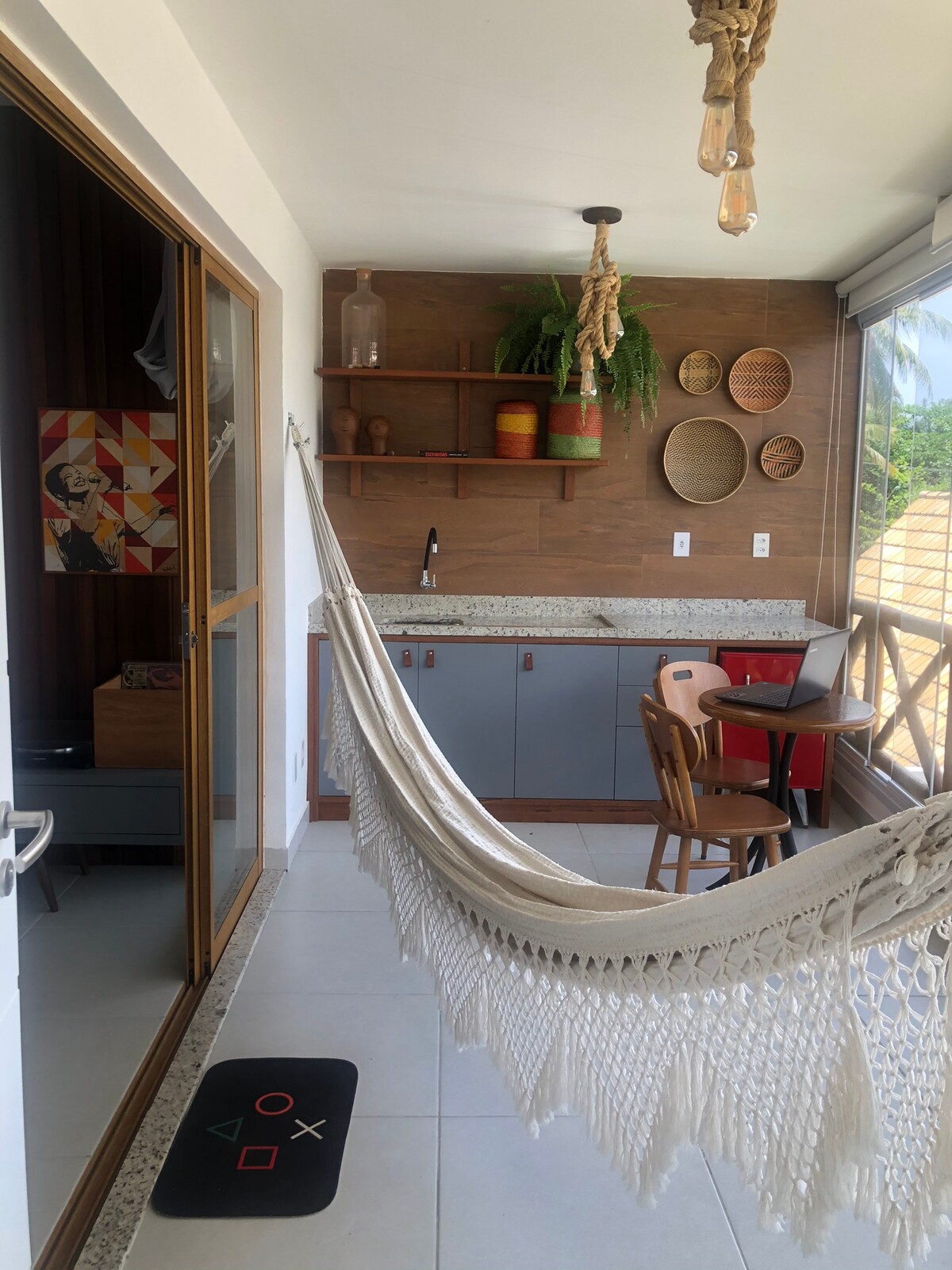 The apartment is located in Village Lagoa Ville, right on the beach. The condominium has a swimming pool, barbecue area, and leisure area. It has two suites, a living room, an equipped kitchen, a balcony, and a small terrace on the 2nd floor. Each bedroom has a double bed, and one of them has two extra mattresses. It has 24-hour concierge service and local security. Next to it is the Itacimirim Lagoon, a calm and secluded environment. It is 5 km from Praia do Forte. Wi-Fi, Netflix, and books.