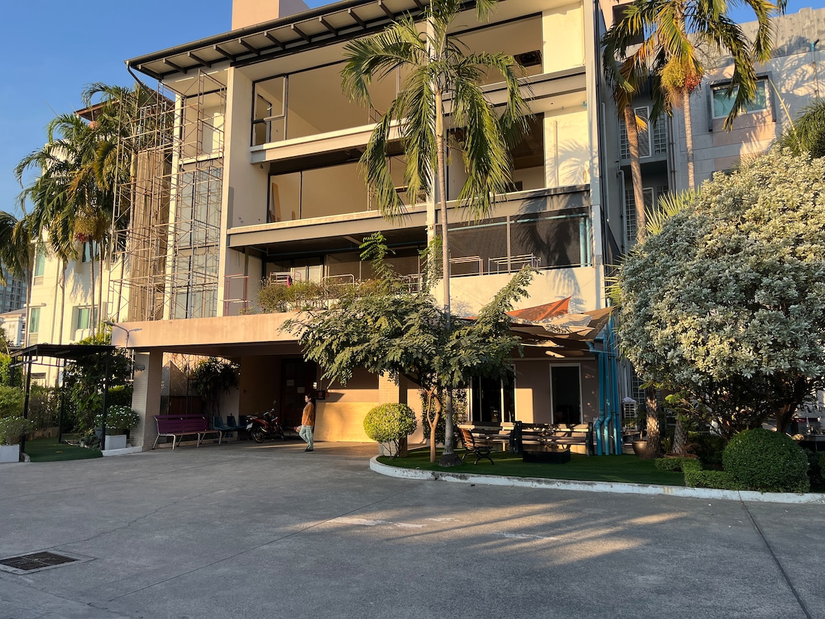 1 großes Zimmer, Wohnzimmer und Schlafzimmer. Es hat viel Platz, Aussicht, sehr gute Atmosphäre. Perfekt zum Entspannen oder für Meetings. Mit Parkplatz. Die Zimmergröße ist 34 qm. Voll ausgestattet mit Kühlschrank, Wasserkocher, Wasserkocher, Mikrowelle, TV, Wohnzimmer, 2 Klimaanlagen. Du hast Swimmingpool, in der Nähe von 7-Eleven, Don Mueang International Airport, so viele Geschäfte! Als medizinische Klinik, Mali Market für ein ECHTES thailändisches Einkaufserlebnis, Impact Arena für Großveranstaltungen & Handelsshows, gutes Café; Bon A Blissx, Central Mall und Koh Kret Island für Töpferkurs! Kostenloses WLAN