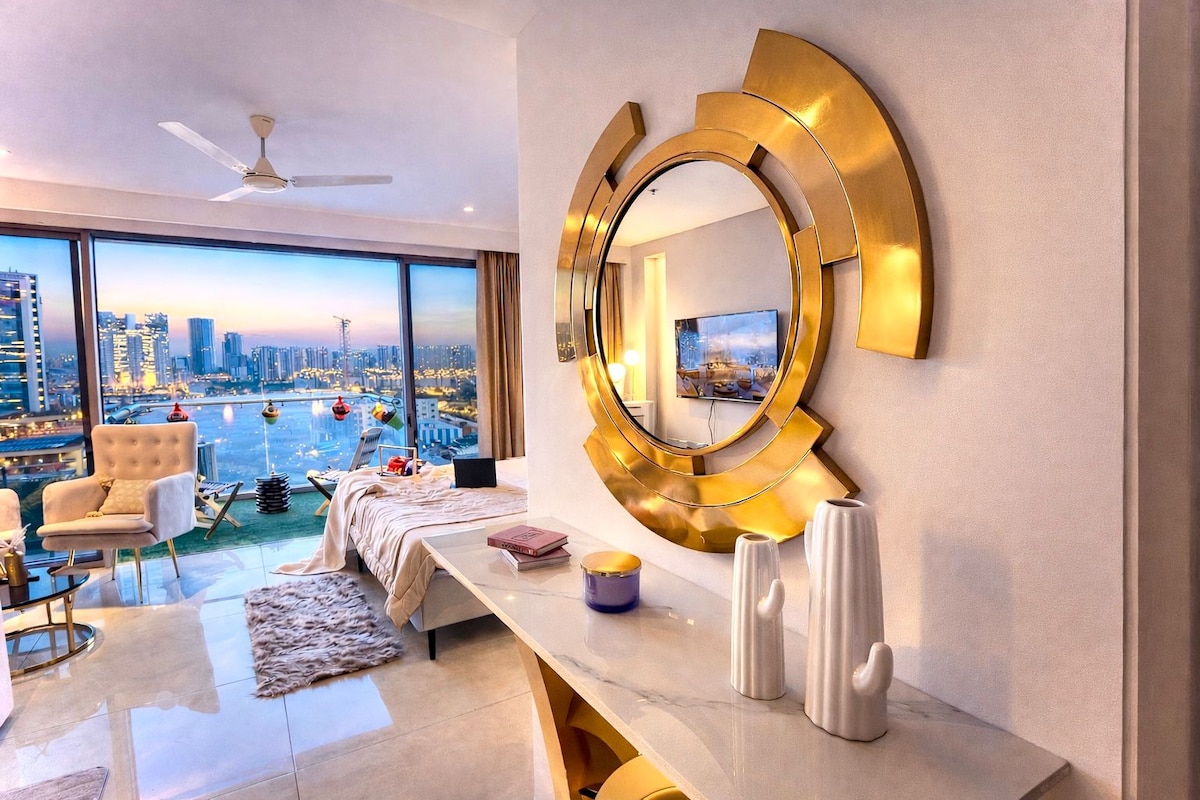 Wir präsentieren unsere exquisite Luxus-Studio-Wohnung: Eingebettet im Herzen der Stadt, bietet dieses opulente Studio moderne Eleganz und unvergleichlichen Komfort. Das offene Design lädt dich in einen geräumigen Rückzugsort ein, der von natürlichem Licht durchflutet wird, das durch die großen Fenster eindringt, die einen atemberaubenden Blick auf die Stadt bieten. Diese Wohnung befindet sich im 41. Stock in einem der höchsten Wolkenkratzer in Delhi – NCR. Die Wohnung hat einen Blick auf den Fluss vom Balkon!!