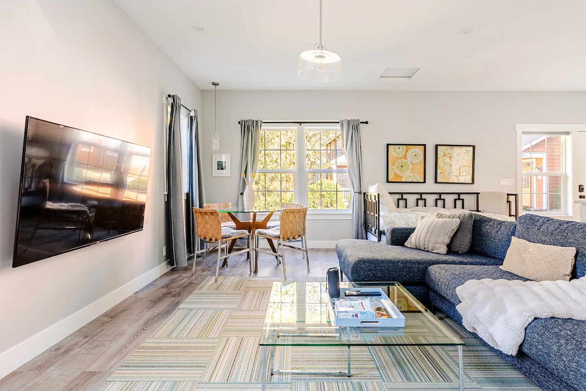 17 windows & 4 skylights flood this modern 900 sq ft space with light & offer stunning views of majestic pines framing the water. Enjoy a 2 min walk to beach & 10 min walk to Battle Point Park. Relax in indoor sauna, enjoy oversized rain shower with hand wand. Bathroom inc double vanity & radiant floor heating. Enjoy cooking/entertaining in a fully equipped kitchen with large island bar, Chef's gas cooktop, double oven & full sized fridge/freezer. Pack light! Equipped with washer/dryer.