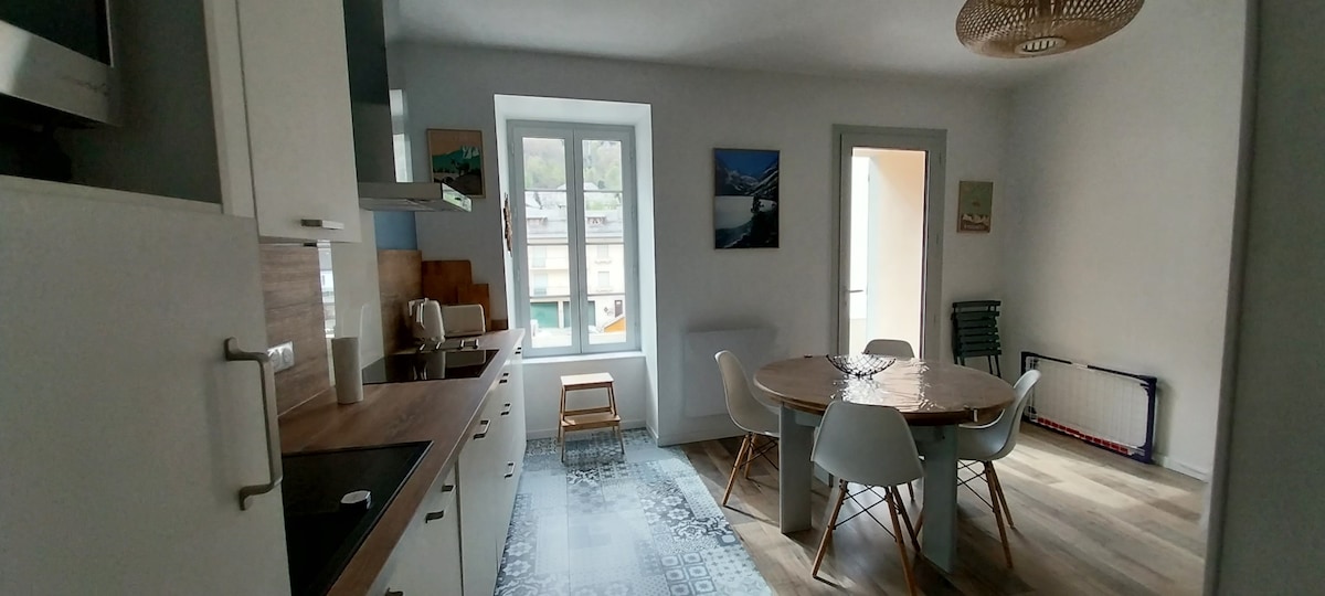 Appartement 56m2 , idéal pour 4 à 6 personnes, en famille, entre amis, situé en plein cœur de Cauterets. Duplex, type T3, les chambres sont en bas et la pièce à vivre est à l'étage avec balcon et grande baie vitrée. Très lumineux, tout confort. Vous êtes au calme tout en profitant des commodités. Tout peut se faire à pied! À 2 min des télécabines, hypercentre, situation idéale pour les skieurs, amateurs de VTT, de randonnées, de thermes Tarif curiste (écrivez nous)