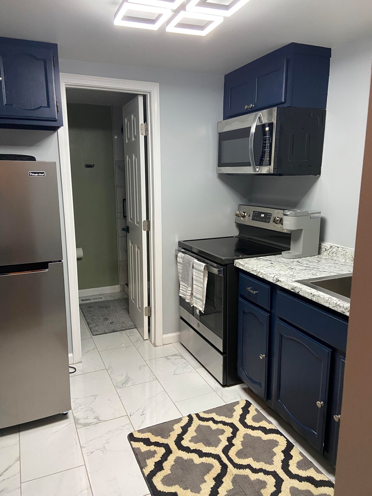 Zweizimmerwohnung im Erdgeschoss. Keine Stufen. Separater Eingang vom Haupthaus. Privater Eingang und Parkplatz. Es gibt einen Eingangsraum mit einem Doppelbett, einem Doppelbett, einem Sofa und einem kompletten Kühlschrank. In einem separaten Wohnbereich gibt es ein Queensize-Bett, einen Fernseher, ein Badezimmer, einen Schreibtisch, einen Tisch, eine Mikrowelle, einen Umluftofen, eine Heißluftfritteuse und einen Gaskamin. Kein Backofen. Draußen gibt es eine große Fläche zum Gasgrill im Freien, Picknicktisch und Feuerstelle. Hunde sind erlaubt und müssen an der Leine geführt werden, wenn sie sich im Freien befinden. Bitte KEINE KATZEN. Der Besitzer ist allergisch