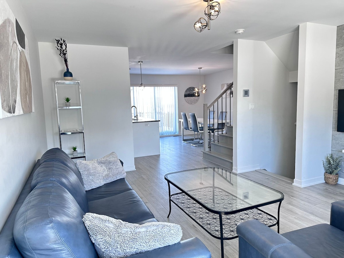 Gemütliches Familienchalet in Laval Genieße einen ruhigen Aufenthalt in diesem geräumigen Haus mit 3 Schlafzimmern — perfekt für Familien, Paare oder Arbeiter. Es liegt in einer ruhigen Gegend in der Nähe eines Parks und des Flusses, nur eine kurze Fahrt von Montreal entfernt. Schlafzimmer • Zimmer 1: Queensize-Bett (110” × 157”) • Zimmer 2: Einzelbett (100" × 107") • Dachgeschosszimmer: Queensize-Bett + Einzelbett (Dach 67 Zoll) Küche Ausgestattet mit Toaster, Mikrowelle, Backofen, Kühlschrank, Gefrierschrank, Kaffeemaschine und Nespresso. Zwei FireTVs zum Streamen sowie Spiele und Spielzeug für Kinder.