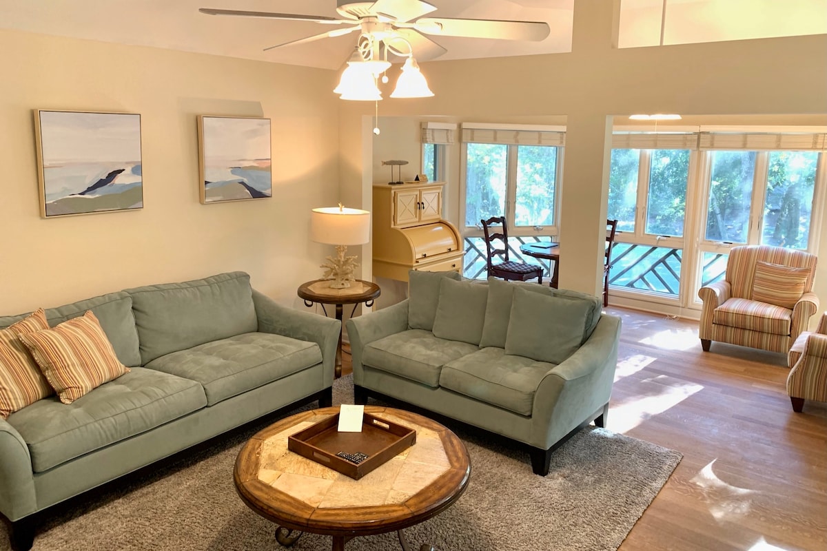 Escape to our unique, pet-friendly waterfront treehouse on Seabrook Island! This updated 2-bed, 2-bath retreat offers serene lagoon views and a swing bed at the water's edge. Surrounded by nature, it's perfect for a relaxing getaway. Enjoy a short walk to the beach, community pool, and gym. Ideal for small groups or families seeking a tranquil island experience. Your private, elevated nature retreat awaits!
