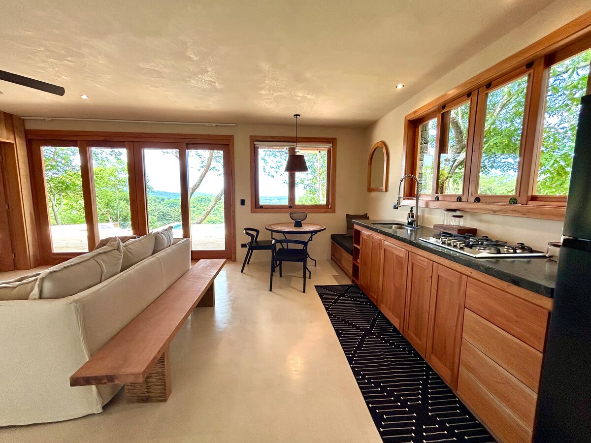 From this hilltop location above Tamarindo Bay, you will enjoy a panoramic view that is unbelievable. You’ll see what we mean when you get here! The Casita offers a king bed and a pull-down Queen bed, fully equipped with a private bathroom, kitchen, and a small balcony with ocean views and perfect for watching monkeys in the surrounding trees! You will also have access to the property's social space including a breezy covered terrace by the ocean-view pool and rooftop lounge!
