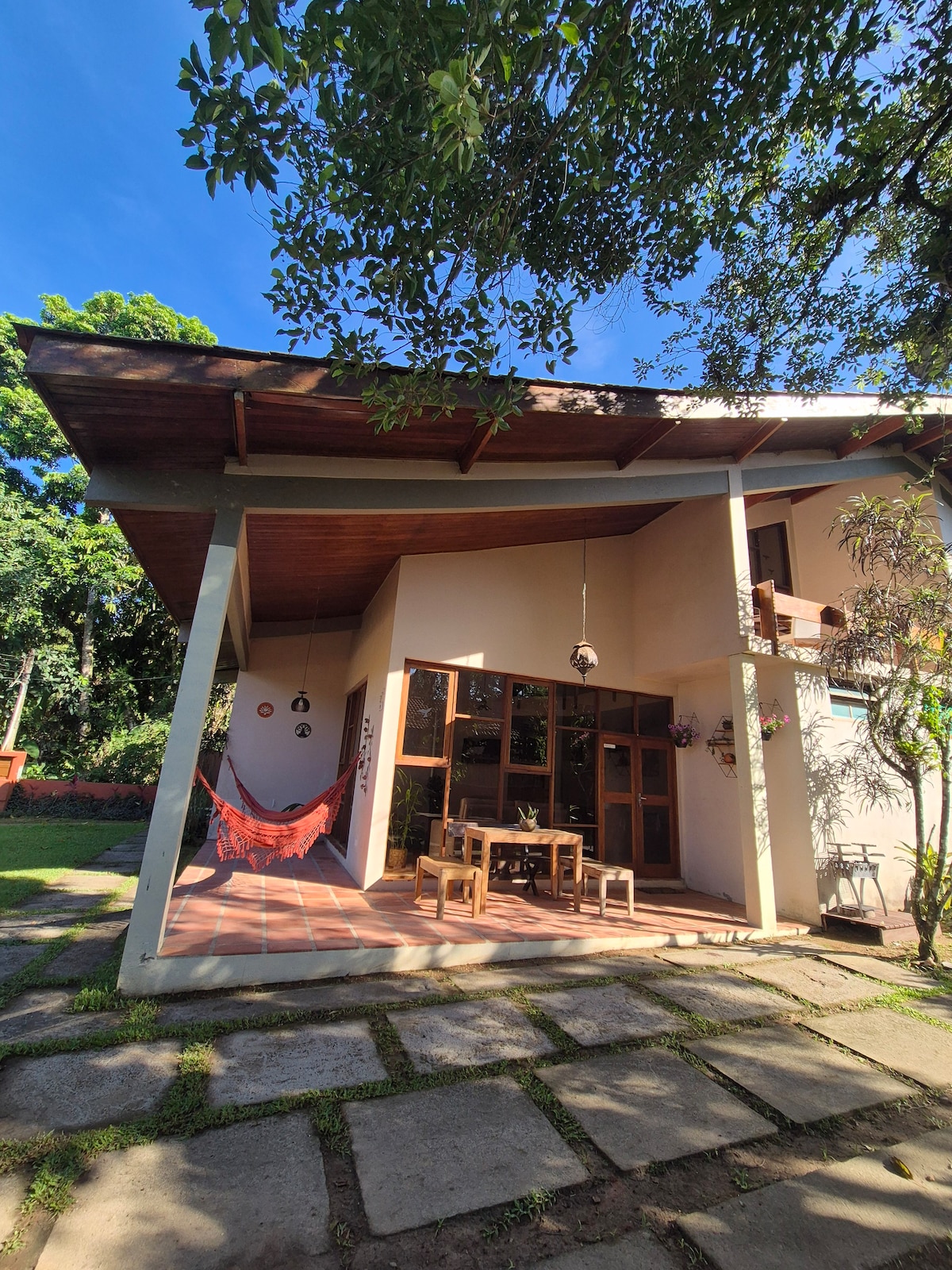 🏝️ Um Refúgio Tropical no Prumirim Localizada em uma rua tranquila e arborizada do loteamento Aldeias do Prumirim, esta casa acolhedora está cercada pela exuberância da Mata Atlântica, que praticamente se debruça sobre o imóvel. A arquitetura praiana, o ambiente tropical e o projeto voltado para a face norte garantem uma casa ensolarada o dia todo, com clima de privacidade e aconchego — perfeita para quem busca descanso e contato com a natureza.