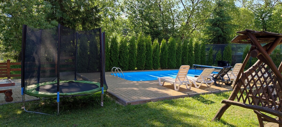 Сімейні апартаменти чудово підходить для відпочинку, невеликої компанії з 4 осіб. Тут дві затишні спальні з двоспальними ліжками, вітальня з кухонною зоною, обладнаною всім необхідним для приготування їжі, та панорамна тераса.Також є окрема зона для BBQ. На території басейн з підігрівом,волейбольний майданчик.Окремі зони для відпочинку. Є чан та сауна. Відмінне розташування: поруч гори, ліс, гірська річка, та зручний доїзд, що дуже важливо у гірській місцевості.