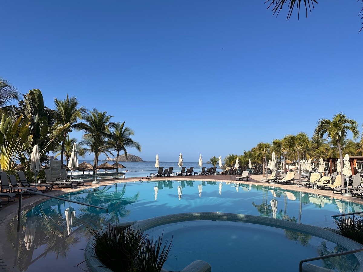 Genieße das ganze Jahr über den schönen Strand. Genieße einen einzigartigen Meerblick, indem du in dieser Eigentumswohnung am Meer im 6. Stock eines der schönsten Luxusresorts von Ixtapa übernachtest. Schwimme im Infinity-Pool, entspanne dich unter einer Palapa am Strand, verwöhne dich mit einem Drink im Restaurant am Pool oder einer Massage im Spa, spiele eine Runde Tennis oder paddle. Oder bleib drinnen und trinke einen Premium-Kaffee auf dem Balkon, während du den atemberaubenden Blick auf den Pazifik und die schillerndsten Sonnenuntergänge genießt. Diese Unterkunft hat einfach alles!