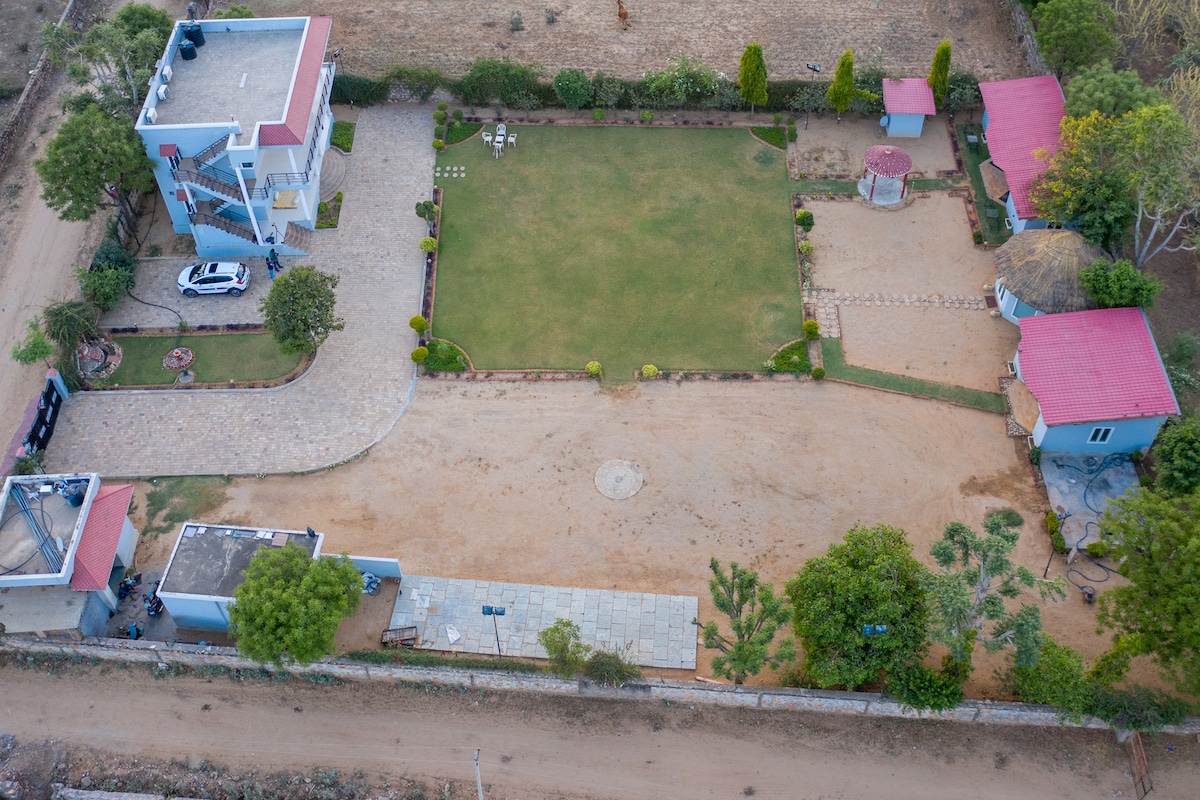 Relax at Lush Green Retreat, a tranquil farmhouse escape in Sitapura, Jaipur. Dive into our refreshing swimming pool, enjoy lush gardens, or unwind in a spacious, beautifully decorated bedroom. Fully equipped kitchen, private bath & gated parking. Food is available (pre-order, extra charge). Near Chokhi Dhani (10 mins), Airport (15 mins), Central Jaipur (25 mins). Ideal for couples, families, solo travellers, parties & celebrations! Pool closed in winter