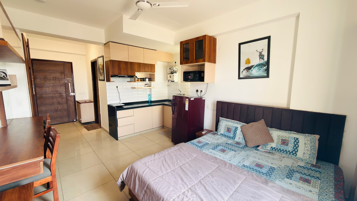 Modern, fully furnished studio in secure Ashadeep Rainbow community near Bombay Hospital & JECRC University. Ideal for medical visitors, business travellers & digital nomads. Queen bed, private bathroom with geyser, well-equipped kitchenette, Smart TV, AC & dedicated workspace. Enjoy rooftop seating & parking. 24/7 security & elevator. Close to airport, Sitapura Industrial Area & attractions. Thanks, Reservation Manager