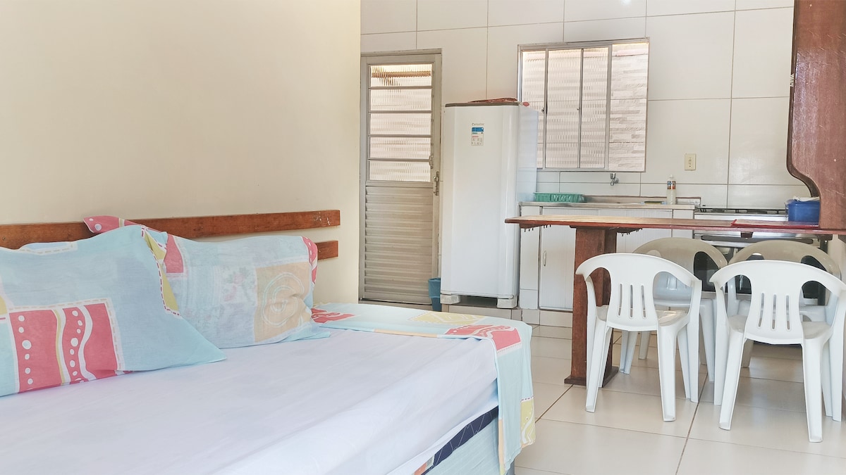 Flat para até 2 pessoas: ar condicionado cozinha equipada 1 cama queen size espaço home office wi-fi + tv c/streamings Roupa de cama e toalhas de banho são fornecidas Kit praia compartilhado: 1 guarda-sol 1 caixa térmica 1 churrasqueira portátil 2 cadeiras de praia Área de serviço compartilhada: máquina de lavar, varal e tanque Área comum: Chuveirão externo Você pode estacionar gratuitamente em frente ao flat Seu pet é bem-vindo mediante taxa de limpeza. Todas as tomadas são 220v.