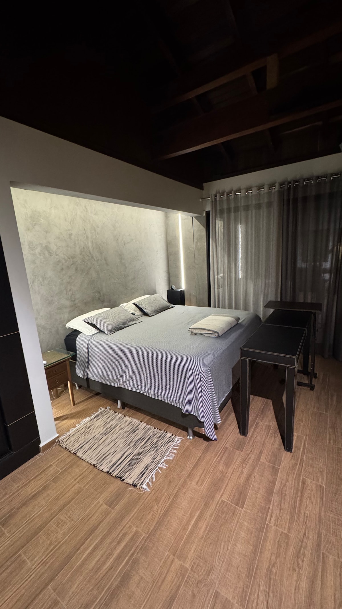 Ofereço uma estadia aconchegante, com A/C e com uma vista da cidade. Na residência você encontrará lençóis e toalhas limpinhas. Uma cozinha com utensílios, cocktop, micro-ondas, geladeira, na sala um sofá extensível e tv 54’ com NetFlix, 3 quartos, sendo 2 quartos com cama de casal e 1 quarto com cama de solteiro, 1 BWC, tábua e ferro p/ passar, secador de cabelo e Wi-Fi. Apenas a lavanderia (que fica na parte externa do imóvel) é de uso compartilhado com as outras 2 casas do condomínio.