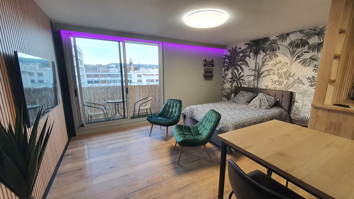 Ideal gelegen, nur einen Katzensprung vom Jardin Lecoq entfernt Sehr gute Anbindung mit Bus und Straßenbahn in unmittelbarer Nähe, sowie ein Supermarkt 7 Tage die Woche bis 20:30 Uhr, auch sonntags, weniger als 100 m entfernt, Bäckerei und Apotheke. Ein überdachter und sicherer Privatparkplatz ist inbegriffen Maximale Höhe 1,90 m WLAN (Glasfaser), 150 cm HD-TV. Vom Balkon aus haben Sie einen Blick auf die Kathedrale und können die Sonnenuntergänge über dem Puy de Dôme bewundern. Die Betten sind hochwertig, Queen-Size 160 x 200