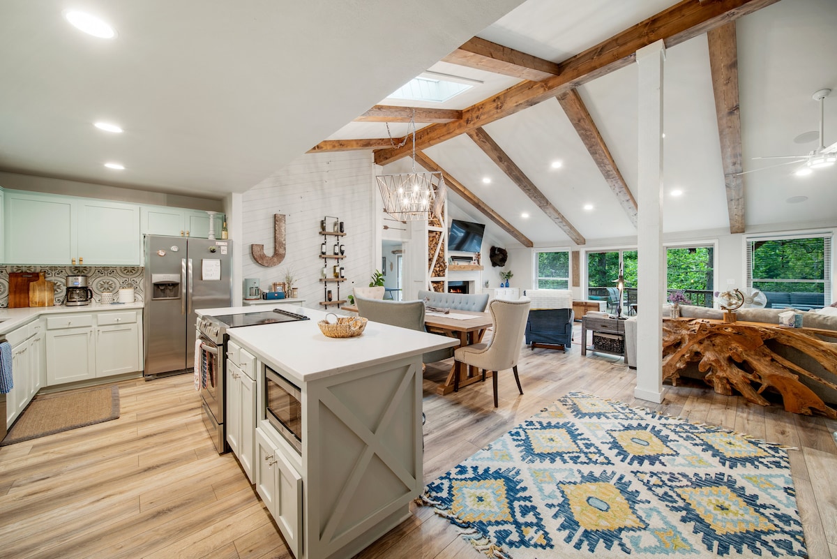 Moderne, brandneue A-Rahmen-Hütte am Fluss. Mit Blick auf den ruhigen Illinois River. Beobachte die Schwimmer ganz bequem von deiner Terrasse aus. Die Hütte ist luxuriös mit allen modernen Annehmlichkeiten, einem professionell gewarteten Whirlpool, schnellem WLAN und Roku-TV. Dies ist der perfekte Ort, um mit einem geliebten Menschen für ein langes Wochenende am Fluss davonzuschleichen. Tagsüber beobachtest du den ständigen Strom von Schwimmern und Kajakfahrern, am frühen Abend ist die Tierwelt an der Reihe, wenn Adler, Eulen und Kraniche die Ufer übernehmen.