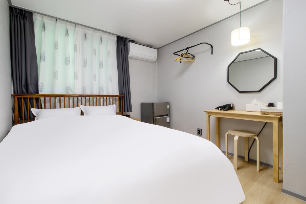 Dies ist ein Einzelzimmer mit 1 Super-Einzelbett. Nutze ein eigenes Badezimmer. Wir tun unser Bestes in Sachen Sauberkeit, damit du dich mit gepolsterten Matratzen und gemütlicher Bettwäsche ausruhen kannst, die dir helfen, in einem Raum zu schlafen, der für vollständige Entspannung und Heilung vorbereitet ist. Du kannst die trendige Sensibilität mit dem einzigartigen Interieur spüren und eine gemütliche Unterkunft mit gemütlicher Bettwäsche und einem gemütlichen Zimmer erleben. Angrenzend an Chungjang-ro gelegen, können Sie eine Vielzahl von berühmten lokalen Restaurants in der Nähe genießen. Es ist auch in der Nähe von Unterhaltungs- und Spirituosenmärkten, und wir bieten Gepäckaufbewahrungsdienste an, damit Kunden Gwangju bequem zu Fuß erkunden können.