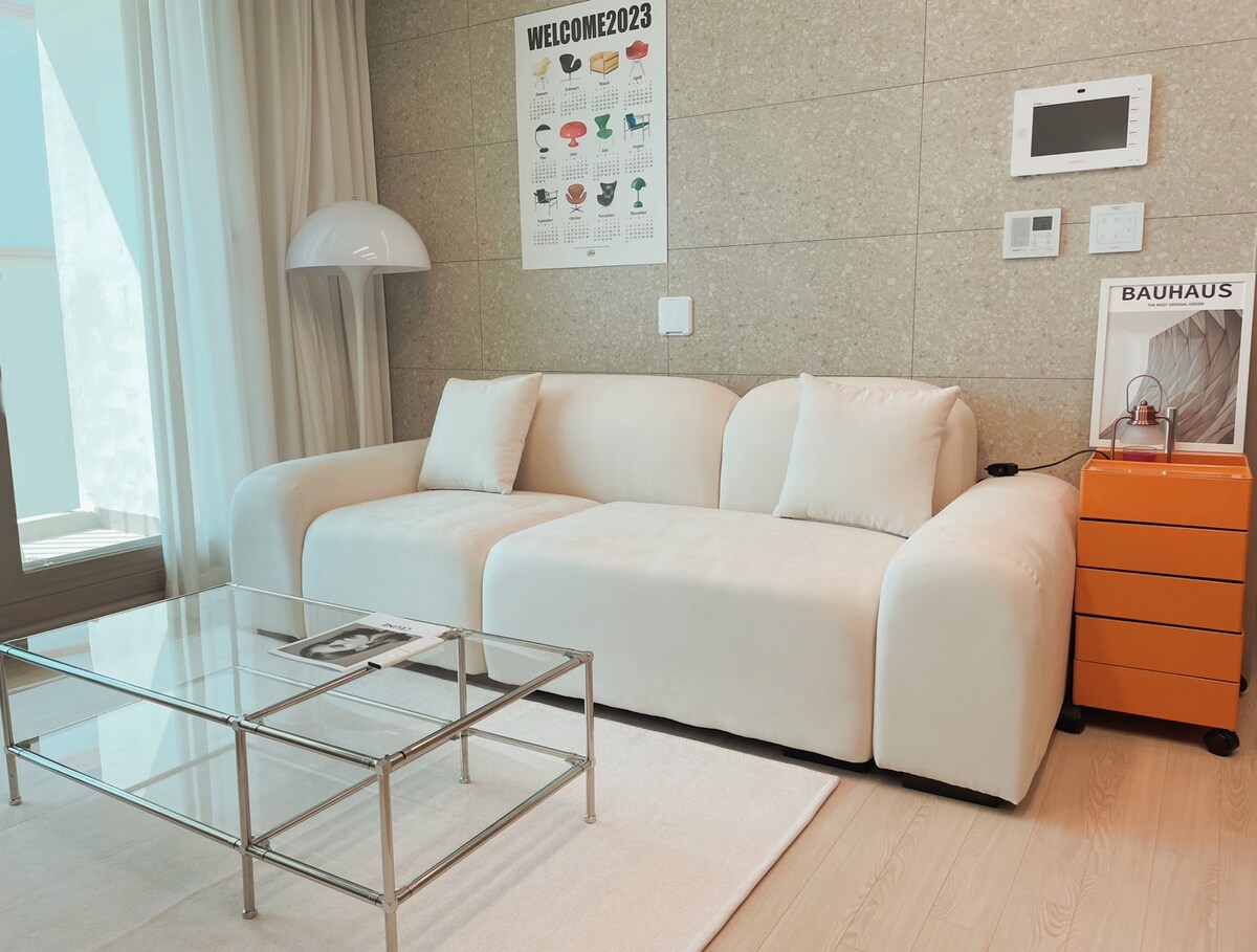 {Sonderpreis, Zwei Zimmer} Kostenloses Parken, Rabatt für mehrere Nächte, Netflix | Meerblick | Gemütliche Erholung | 10 Minuten zum Yi Sun-Shin-Platz und zu touristischen Sehenswürdigkeiten | 2 Schlafzimmer, Wohnzimmer