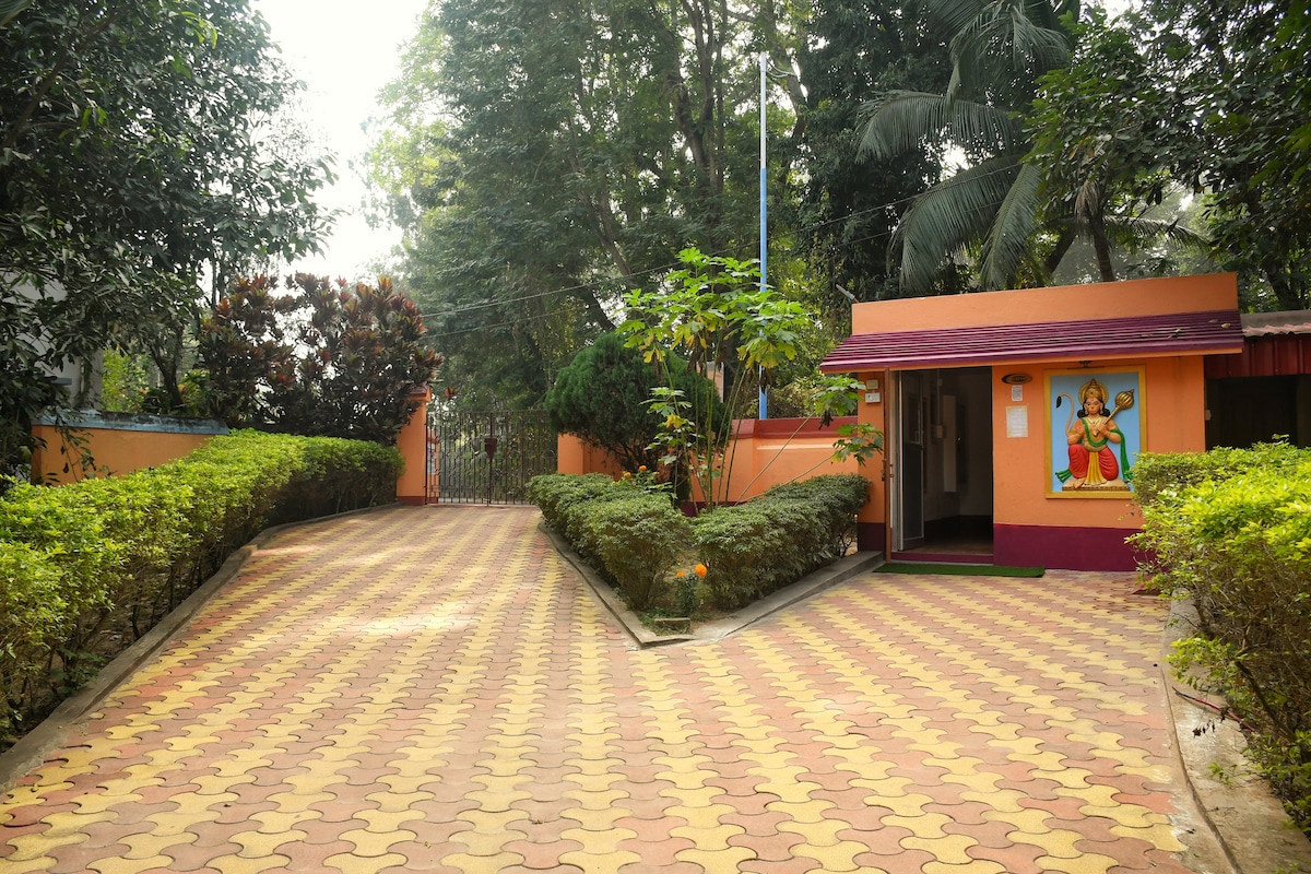 Rustikaler Bungalow im bengalischen Stil in der Nähe von Baba Mandir & Satsang Erlebe den Charme eines traditionellen Bungalows im bengalischen Stil, nur wenige Minuten vom Stadtzentrum und Baba Mandir entfernt. Dieser Rückzugsort bietet Annehmlichkeiten wie Klimaanlage, Kühlschrank, Warmwasserbereiter und Herd. Mit Blick auf einen lebendigen Garten können die Gäste in der Saison mit frischen Mangos, Zitronen, Brinjals oder Chilischoten verwöhnt werden. Eingebettet in eine ruhige, sichere Nachbarschaft, ist es der perfekte Ausgangspunkt für Entspannung und Erkundung. Hier erwartet dich eine Mischung aus Tradition und Komfort!