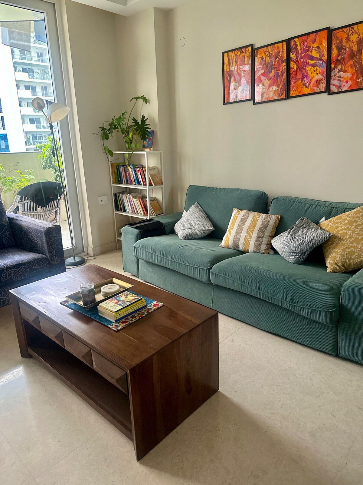 Ruhige, geräumige, paarfreundliche Wohnung: - stilvoller Wohnbereich: Bücher, Brettspiele - beladene Küche - schönes Schlafzimmer: Fernseher mit DTH (Hunderte von Kanälen) und OTT-Apps (acnt reqd) -: offene Aussicht auf die Skyline von Gurgaon - sauberes Badezimmer - Arbeitsplatz - Strategische Lage: Einfache Anbindung von NH48, Dwarka Expressway, SPR, American Express, Air India, TCS, Skyview Corporate Park, DLF Grüne Unternehmen - kostenlose überdachte Parkplätze - Einkaufszentren, Inox, Pubs und Restaurants auf demselben Gelände - rund um die Uhr Taxis