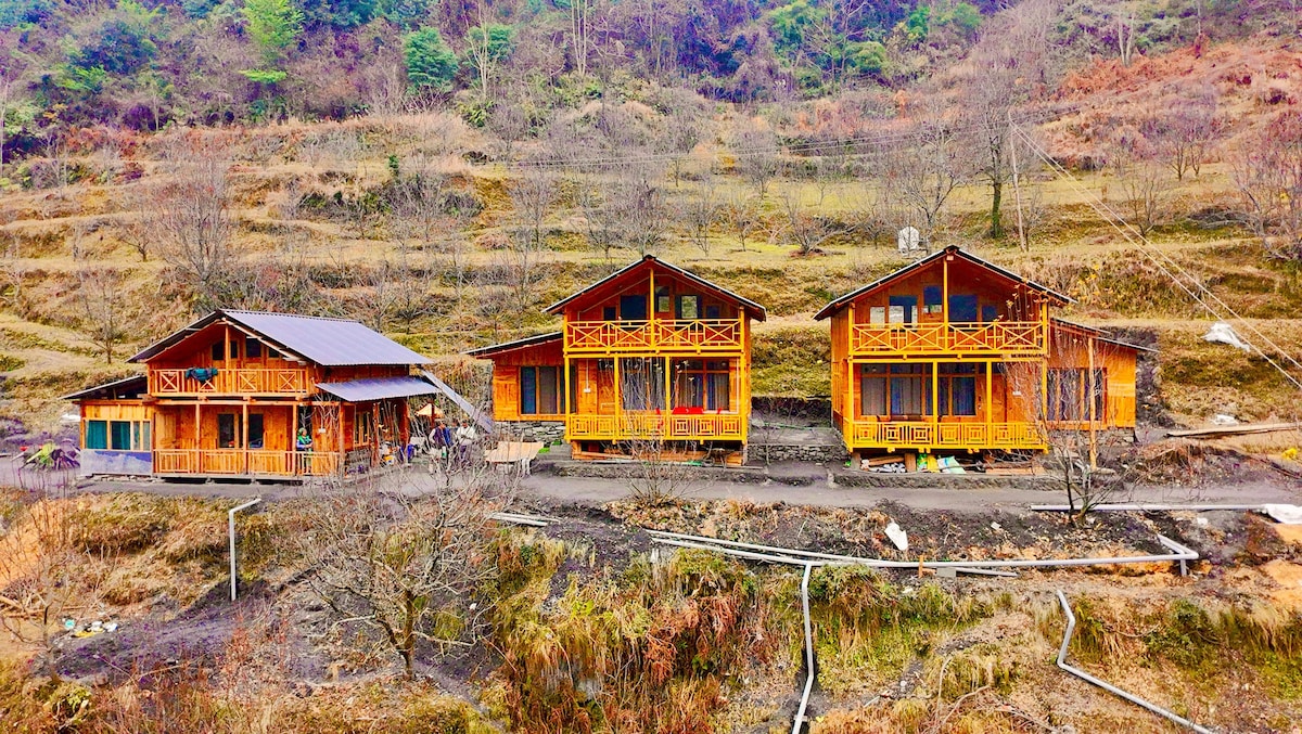 You'll love this unique and romantic escape. ★ Pinewood Architecture ★ Amazing views ★ Wi-Fi ★ Power Backup ★ in-house food service ★ Bonfire area ★ Spacious Balconies ★ Garden Please note, - There is 50mtrs from parking spot to the property, We will pick your luggage. - Breakfast, Room heaters, Bonfire & all other services area exclusive of stay price here.