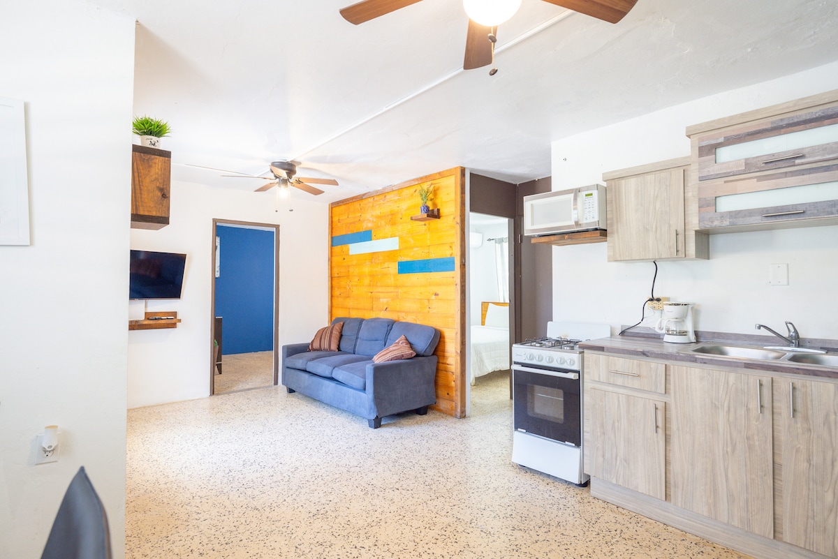 Gehen Sie unseren privaten Weg zum Meer, wo der Strand sehr ruhig ist. Zwischen Jobos und Shacks Beach gelegen. Tolles Surfen, Schnorcheln und Kiteboarding entlang der Nordküste. Privat, umzäunt, eingezäunt und viel Parkplatz. Studio A im Pedro's Palms verfügt über Klimaanlage, Deckenventilatoren, abgeschirmte Türen und Fenster, um die karibische Brise zu genießen. Fliesenböden und Gehwege. Serta-Queen-Size-Matratzen und Smart-TVs. Voll ausgestattete Küchen, damit du zu Hause essen oder in lokalen Restaurants speisen kannst!