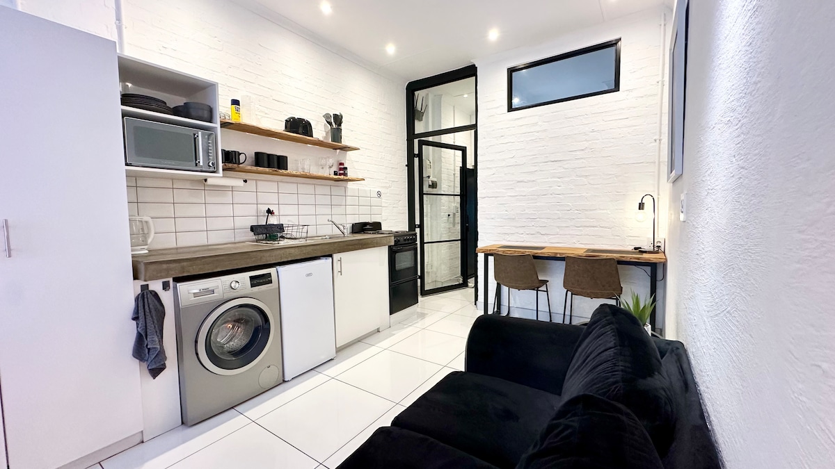 Erlebe ein Apartment mit seinem eigenen, einzigartigen Stil in Maboneng. Dieser durchdacht gestaltete Raum bietet gehobenes Wohnen in der Nähe von Galerien, Restaurants und dem Nachtleben von Joburg. Genieße ein Kingsize-Bett, schnelles WLAN, einen 55-Zoll-4K-Smart-TV mit Netflix, eine Waschmaschine, maßgefertigte Möbel, einen markanten, zwei Meter hohen Holzspiegel, elegante Marmorböden, eine voll ausgestattete Küche, einen sonnigen Balkon mit Blick auf den Garten und den Tauchbecken sowie eine begehbare Dusche. Dank des 24-Stunden-Sicherheitsdienstes ist dein Aufenthalt sicher, privat und sorgenfrei.