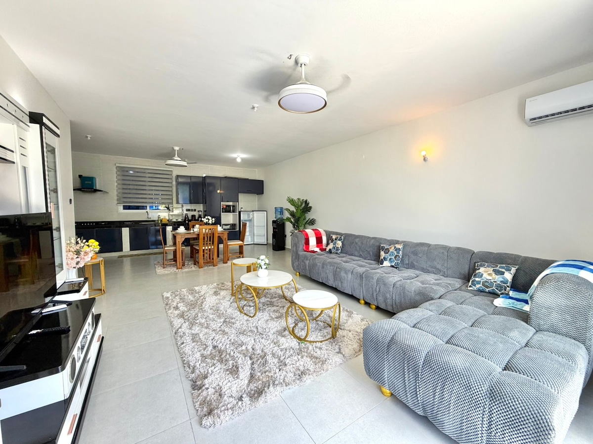 Übernachte nur wenige Schritte vom Strand entfernt in diesem eleganten Penthouse mit Meerblick in Nyali, das auf Privatsphäre und Genuss ausgelegt ist. Sie bietet drei geräumige Schlafzimmer mit eigenem Bad und Smart-TVs, darunter eine ruhige Master-Suite mit eigenem Balkon, Schaukelstuhl und Whirlpool. Genieße eine stilvolle Lounge mit JBL-Sound, eine voll ausgestattete Küche, Klimaanlage, Aufzug, Notstromversorgung, Sicherheit rund um die Uhr und einen gemeinsamen Pool.