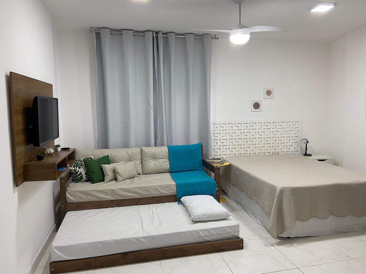 Wohnung mit 01 Schlafzimmer im Loft/Flat-Stil, Deckenventilatoren, Klimaanlage, LED-TV, Internet, frostfreiem Kühlschrank, Mikrowelle und allen Utensilien. Sie befindet sich im 3. Stock (ohne Aufzug), 01 Garagenplatz (möglicherweise einen weiteren im Gebäude mieten) und ein Motorrad-Parkplatz. Privilegierte Lage: Nur 200 Meter vom Strand von Enseada (Straße des Restaurants Rufinos) Viele Geschäfte in der Nähe (Supermarkt Extra, Bäckerei, Apotheken, Metzgerei, Gemüsehändler, Markt, usw.). Alle Einrichtungen, die wir brauchen, ohne dass wir das Auto nehmen müssen.