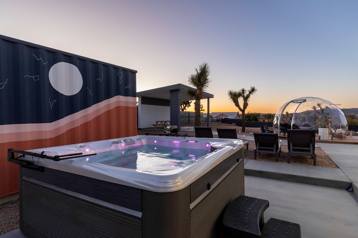 “Sphere In The Rocks” desert retreat w. cowboy pool, jacuzzi, fire pits, daybed, dining & BBQ! ★ “A magical space that encourages connection, reflection, and presence.”❤️ ✔️Architectural sound healing sphere ✔️ Recommendations → Concierge Chef & Sound Bath (ask us!) ✔️Fully equipped + stocked kitchen ✔️Reverse osmosis water filter ✔️Parking → driveway (4 cars) ✔️50 Mbps wifi + workspace ✔️Outdoor shower + tub + fire 3 mins → Joshua Tree National Park Entrance 10 mins → Downtown Joshua Tree