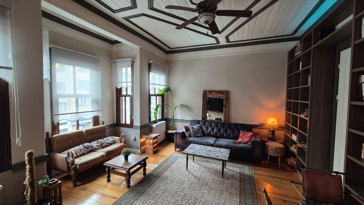 Dies ist unser Zuhause. Wir lieben es. Wir kümmern uns darum, wir kümmern uns auch um das Raumgefühl und die Qualität der Zeit. Wir hoffen, du auch. Diese 160 m² große Einheit mit hohen Decken und 1 Schlafzimmer befindet sich im 4. Stock eines historischen Halbwohnhauses. Obwohl wir gerne denken, dass der Ort voller Ruhe, Komfort und Persönlichkeit ist; die wahre Magie davon ist genau dort, wo er sich befindet. Sie ist kaum eine Minute von den Fähren entfernt und liegt irgendwie ruhig mitten im hektischen Treiben von Kadikoy.