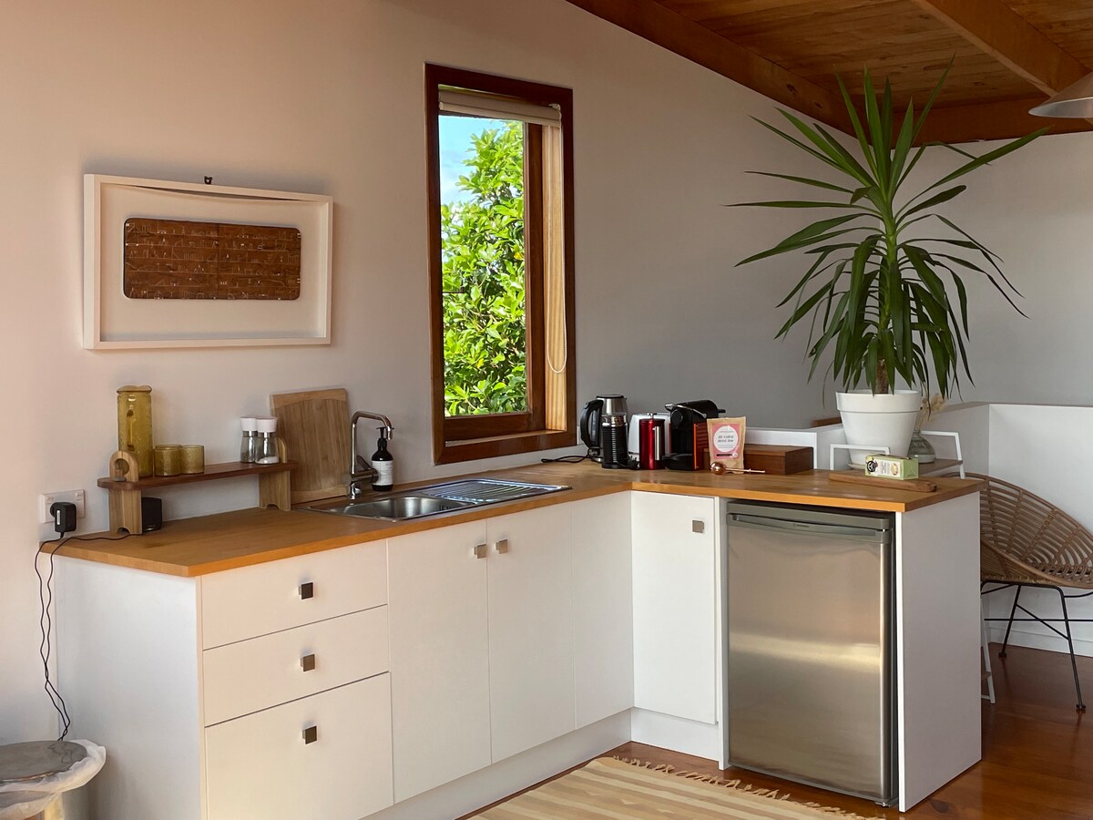 Komm und teile unser fantastisches Anwesen mit uns. Direkt hinter dem Rand einer Klippe, die an den Whangarei Harbour grenzt, findest du ein privates Ferienhaus mit 1 Schlafzimmer, voll ausgestattet mit einer Küchenzeile und einem Badezimmer, umgeben von Meerblick und einheimischem Busch. Ein kurzer Spaziergang durch die Puriri-Bäume führt dich zu deinem eigenen abgelegenen Strand.