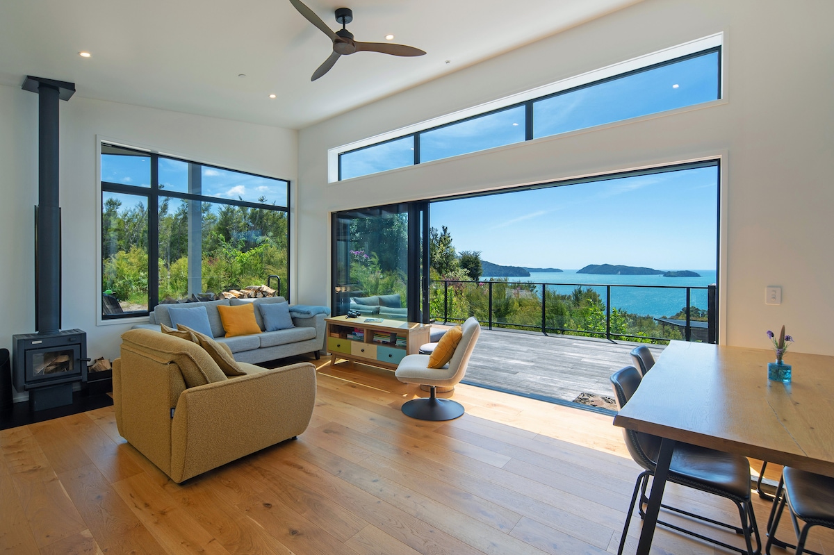 Wache mit Panoramablick auf das Meer, die Inseln und die Berge auf – ein sich ständig veränderndes Bild aus Licht und Farbe entlang der atemberaubenden Küste von Abel Tasman. Eingebettet in 2,5 Hektar privatem, einheimischem Buschland, das vom Gesang der Vögel erfüllt ist, bietet Kokomea einen friedlichen Zufluchtsort, nur einen kurzen Spaziergang vom legendären Split Apple Rock Beach und nur wenige Minuten vom weltberühmten Abel Tasman Track entfernt.