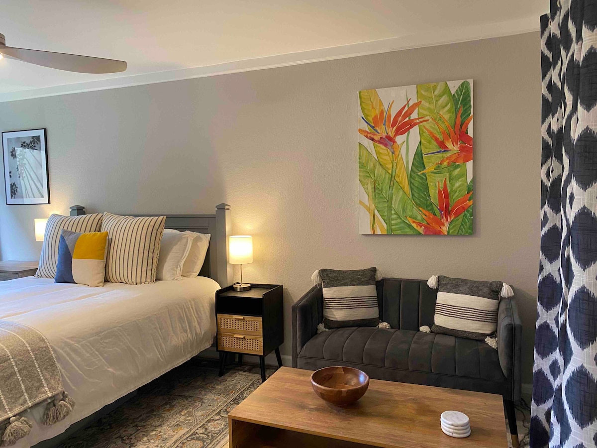 This beautiful remodeled studio is located on Kaua'i's lush and romantic North Shore. Furnished with A/C, VITAMIX Blender, Heavenly king size bed, kitchenette, hot plate, 2 flat screen tvs, and reliable wifi. Be ready to enjoy the breathtaking views and world class hiking, snorkeling, and beaches from this ideal North shore location. A quick walk to Hideaways Beach and Queen’s Bath and short drive to Hanalei. It’s more than just a vacation home, it's paradise!