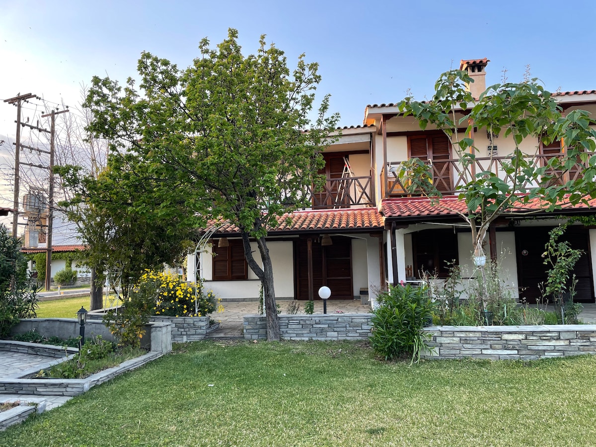 Two in one apartment mezonete! Ground floor and 1st floor apartment with garden, kitchen, bedroom, bathroom and living room 200 metres from the beach, parking, air condition, wifi, new electric appliances, new mattresses and sheets. In a quiet complex, supermarkets and shops in Walking distance, poligyros city 16 km, moudania city 12 km away, nikiti village 25 km away. located between Kassandra and sithonia it is perfect Spot to explore both halkidiki peninsulas without having to drive long!
