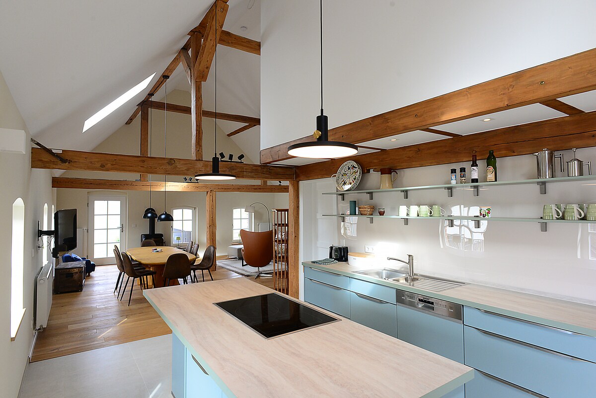 Lehne dich zurück und entspanne Dich in dieser ruhigen, stilvollen Unterkunft. Ob im Sommer in der Hängematte unter alten Apfelbäumen oder im Winter nach einem erfrischenden Spaziergang in der Sauna und vor dem Kamin. Abseits von jeglichen Trubel kannst du die Gedanken über die weiten Felder schweifen lassen, im Liegestuhl den Bienen beim Summen zuhören oder mit den Kindern die Kühe, Schafe und Ziegen in der Umgebung auf den Wiesen besuchen. Schnell Glasfaser WiFi Internet connection 150mb/s