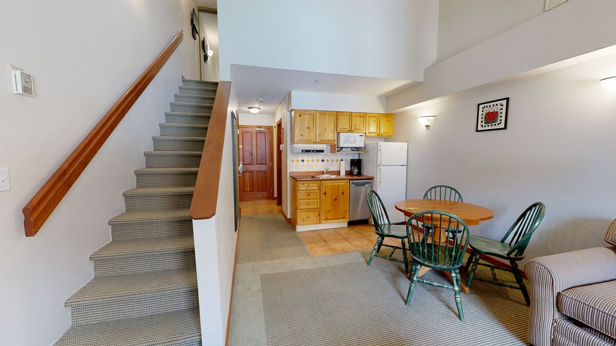 Loft-Einheit mitten im Herzen des Dorfes. Ski in/Ski-out zu den Hauptliften. Nur wenige Schritte von allen Restaurants, Geschäften, Annehmlichkeiten und G.C. Condo entfernt, verfügt es über eine effiziente Küche mit einem 2-Flammen-Herd (kein Ofen), einem großen Kühlschrank, einer Mikrowelle Wasserkocher, Kaffeemaschine und Geschirrspüler, TV, kostenloses WLAN und Gaskamin. Die Wohnung bietet Platz für 4 Personen mit einem Kingsize-Bett und einem Queensize-Ausziehbett. Rauchen verboten. Lodge bietet Skiraum, Münzwäscherei, 2 Whirlpools, Fitnessraum, beheizten Parkplatz, 20 $/Nacht plus GST.