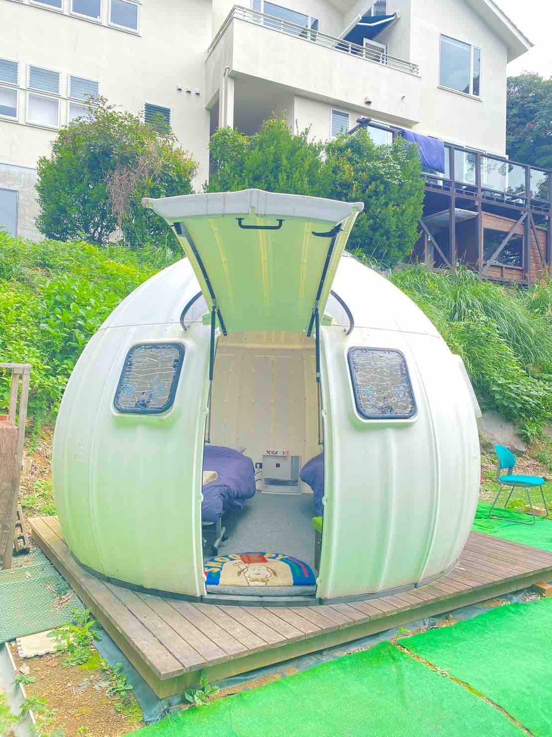 Campingplatz mit 24-Stunden-Nutzungsmöglichkeiten, einschließlich einer privaten Sauna und einer Terrasse mit Blick auf die Sagami Bay. Diese skandinavische Lounge ist der perfekte Ort für Glamping-Anfänger, da es eine Vielzahl von Glamping-Zelten gibt, die zu deinen Bedürfnissen passen. Die Lounge ist komplett mit einem Loft, Bett, Kühlschrank und allem, was du für deinen Komfort benötigst. Die japanische private Sauna kann jederzeit genutzt werden. Außerdem gibt es drei Coleman-Stühle für Wasser und Außenbaden.