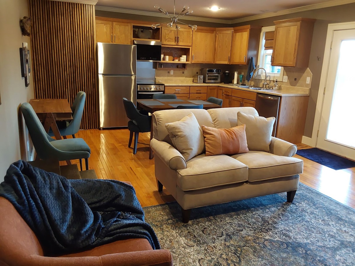 Wenn du auf der Suche nach einem ruhigen Aufenthalt in einer ländlichen Umgebung, aber trotzdem nur wenige Minuten von der Stadt entfernt bist, bist du hier richtig. Genieße den eklektischen Stil dieser Suite mit einem Schlafzimmer auf der unteren Ebene unseres Hauses mit einem privaten Eingang. Wir bieten eine voll ausgestattete Küche mit einigen unserer Favoriten für Snacks. Unser Raum liegt auf unserem Hobbybauernhof. Wir sind nur wenige Minuten von der I-435 und der I-70 entfernt.