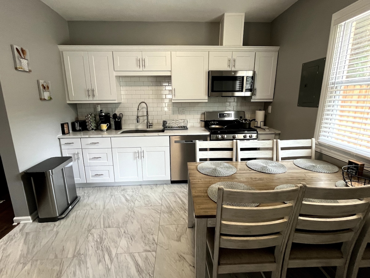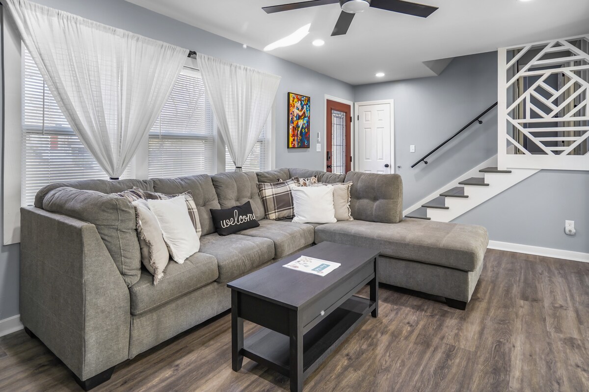 Mach es dir in diesem Designer-Cottage im Mittleren Westen auf Samtsofas in Saphirblau am Kamin gemütlich. Der offene Wohnbereich fließt in die Küche des Küchenchefs und das Bauernhaus-Esszimmer unter atemberaubenden Kupfer-Pendelleuchten. Zwei ruhige Schlafzimmer mit hochwertiger Bettwäsche, komplette Wäscherei, Spa-inspiriertes Bad. Entspanne dich auf der überdachten Veranda mit Steinsäulen oder erkunde Strawberry Hill. Privater Parkplatz, Smart-TVs im gesamten Haus, kurze Entfernung zum SplitLog Coffee. Moderner Komfort trifft auf handwerklichen Charme. Haustierfreundlich. Ihr perfekter KC-Urlaub