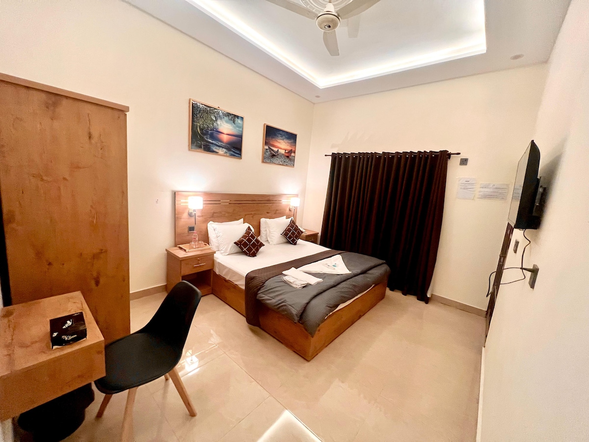 A refined Junior Suite in DHA Phase 8 designed for business travellers who want privacy and a proper work setup. King bed, dedicated workstation, high-speed Wi-Fi, smart TV, minibar/fridge and a luxury interior. 24/7 front office support with secure RFID key-card access at check-in.
