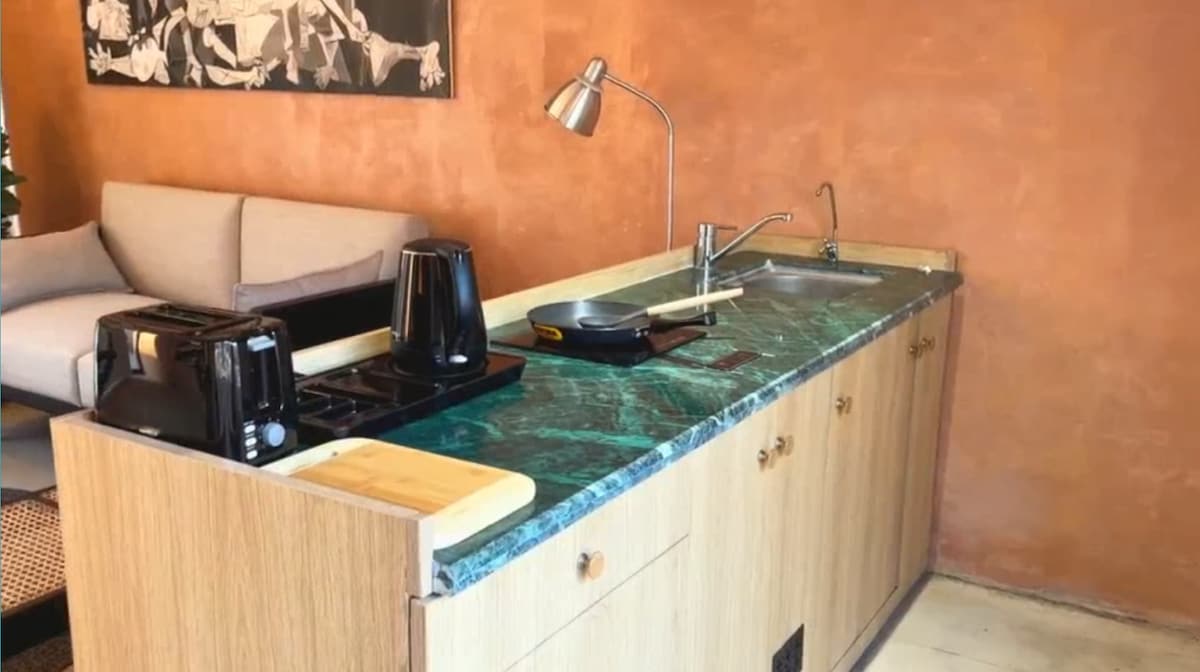 This open-plan studio apartment follows minimalistic design principles. Equipped with a kitchenette, two bathrooms, a full-sized King bed, a queen size Wall Bed, TV with Netflix, Hotstar, PrimeVideo, JioCinema and free WiFi, this space is capable of comfortably hosting a family of four. Please NOTE: This is an open plan apartment, and there are NO private bedrooms, the apartment is on the second floor, so you’ll need to go up two flights of stairs. NO PARTIES PLEASE 🙏🏽 and NO SMOKING 🚭