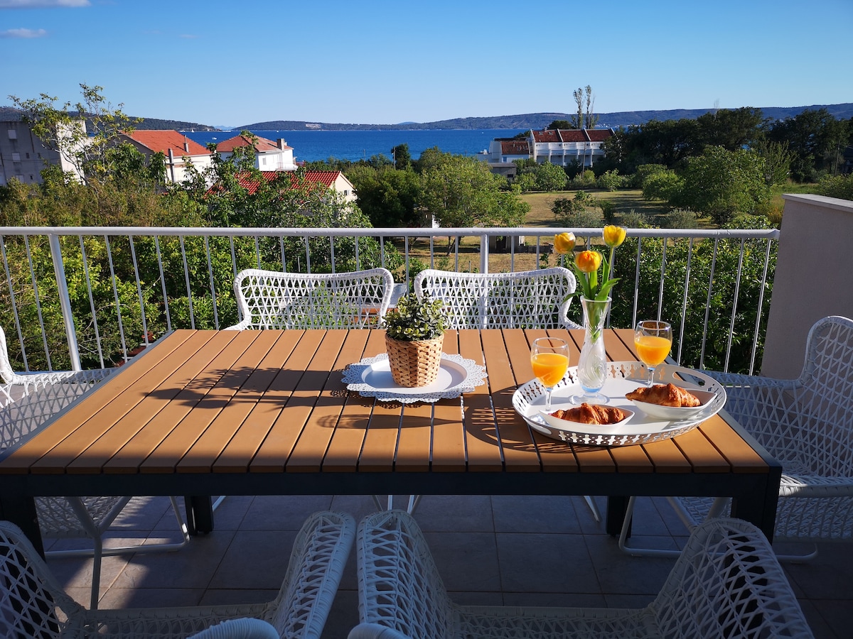 The apartment was newly built, 2021.The apartment is in a block,connected to a family house.. It has two floors with a separate entrance. Guests can use a part of the garden in front of the apartment with a table and chairs. Atractive beach with plenty things to do is 2 minutes . The apartment you can enjoy and relax, and if you want any other activity ,its near by .Trogir is a 15 minute walk and there is a boat every 10 minutes .Enjoy the sun and the Adriatic sea in an attractive location ''.