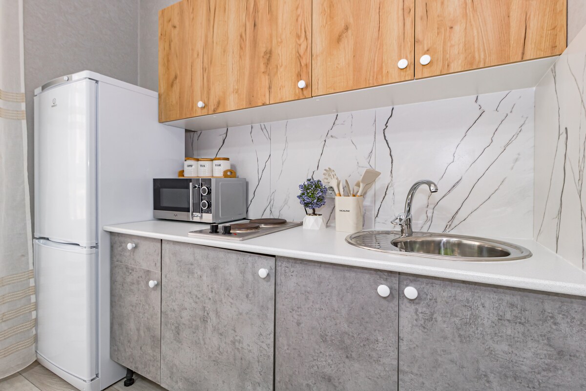 Liebe Gäste, eine gemütliche Einzimmerwohnung mit moderner und hochwertiger Renovierung in ruhigen Farben erwartet Sie. In unseren Apartments können Sie sich nach einem langen Tag entspannen und erholen. Im Schlafzimmer gibt es ein bequemes Bett mit orthopädischer Matratze, die Küche verfügt über alle notwendigen Geräte und Utensilien zum Kochen. Das Badezimmer verfügt über eine geräumige Dusche.