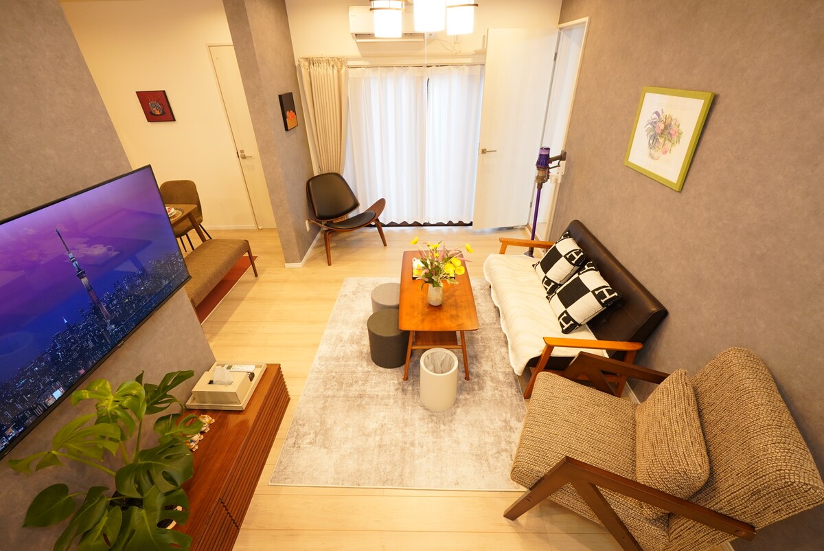 🏡 2-minute walk from Keisei-Koiwa Station A quiet 5th-floor corner unit, set away from train and street noise despite the central location. Direct trains to Narita & Haneda (no transfers) and easy access to Skytree, Asakusa, Ueno and Ginza make this an ideal base. Relax in a Japanese-modern space with natural wood tones. 👶 Baby-friendly (under 2 stay free). 🪟 Two private balconies with seating. 🛒 Convenience store right in front, with shops and restaurants nearby.